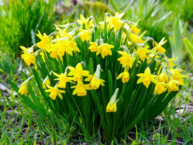 On the swaths of grass, naturalized daffodils have spread like scattered golden coins.