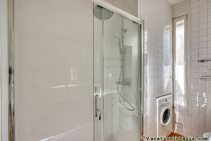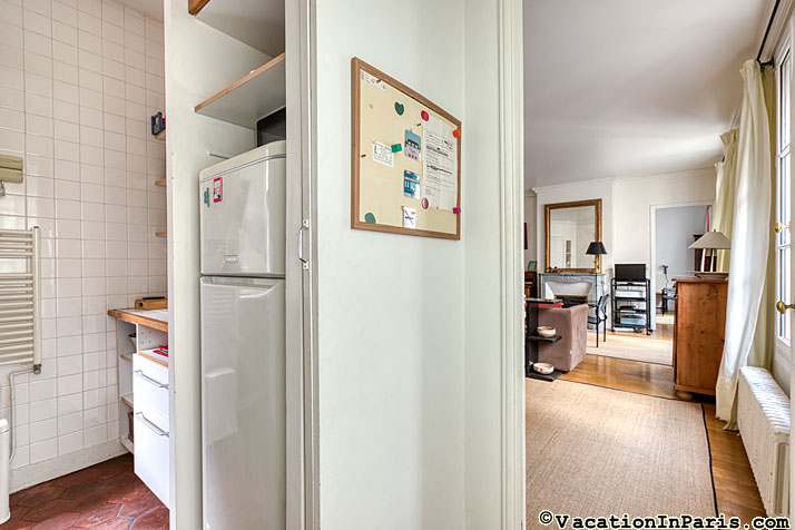 The apartment is located in a building dating from the late 19th century. Enter along a charming cobblestone pathway into a courtyard centered by a picturesque birch tree often filled with chirping birds to welcome you. The apartment is located on the 2nd European floor (3rd US) in a walk-up building. Upon entering, you'll be struck by how calm and luminous it is. A small entryway leads to the small but fully equipped kitchen to your left. It has kept its original brick floor tiles and has a window with a pleasant view overlooking another courtyard. You will find the kitchen is perfectly equipped with everything you need to prepare your meals or snacks: oven, stove, full size refrigerator, dishwasher and microwave.