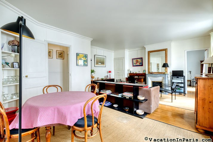 Moving along into the living room, you'll find it is spacious and light, with two French windows overlooking the courtyard. Warmed by parquet floors and comfortable seating, it's also attractively decorated with abstract art and a fine collection of books for your enjoyment. The décor is a mix of traditional Parisian style with modern touches. Completing the room is a dining table that can seat up to 6 guests.