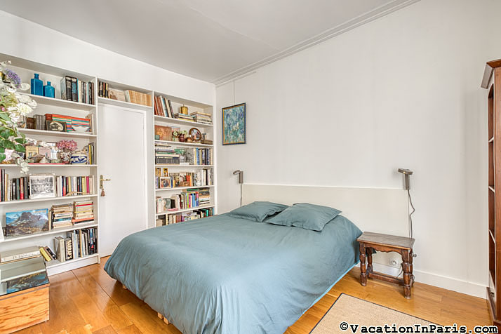 Beyond the living room, is a large comfortable bedroom with a queen bed. It's extremely quiet, perfect for a good night’s sleep. There are again shelves of books for your nighttime reading pleasure. Sufficient closet space is available for stowing away your luggage.