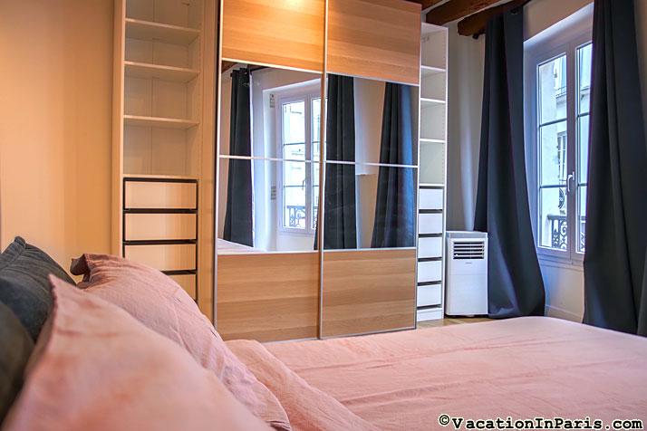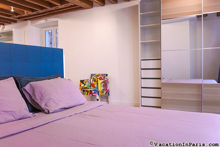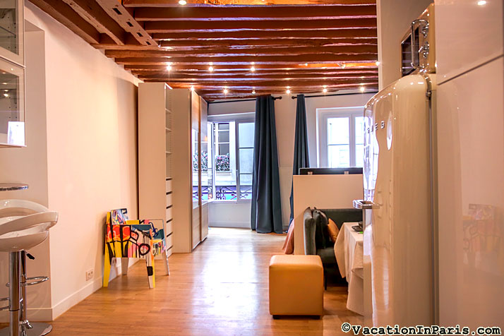 This spacious studio is located on the 1st European floor (2nd US) in a walk-up building from the 1850’s. While the building might be old, this pied-à-terre has been fully renovated. The owner has created a beautiful mix of old and new – exposed beams that seamlessly blend with modern touches like the fun lighting. As you enter, you’ll be greeted by a bright and spacious home. Lots of windows, hardwood floors, crisp white walls and warm tones that all blend harmoniously together.