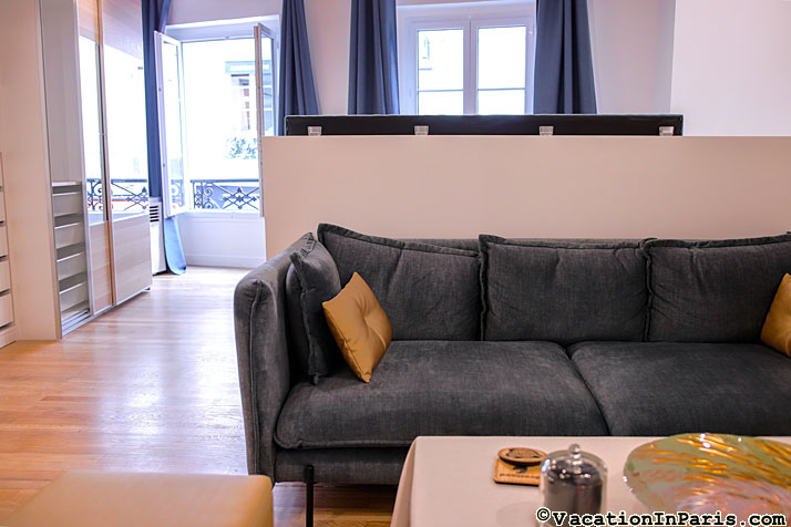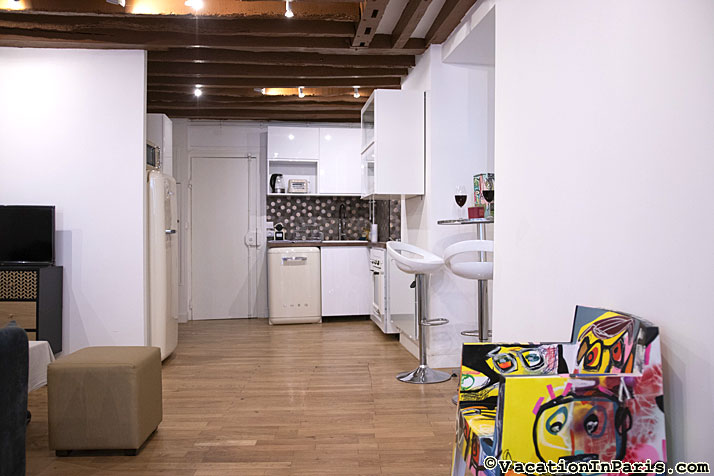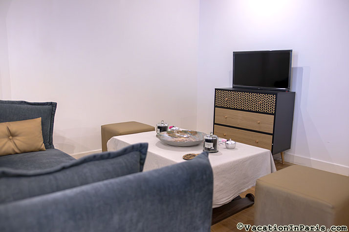 As you continue walking into the apartment, the living area is to the right and has a comfy couch, which can sleep a child or young adult when you add a futon-style pad on top. There’s a coffee table that can be raised up to be used for eating, along with a couple of cube-style chairs. Here you can relax after a long day exploring the city while watching some TV or deciding what to do next.