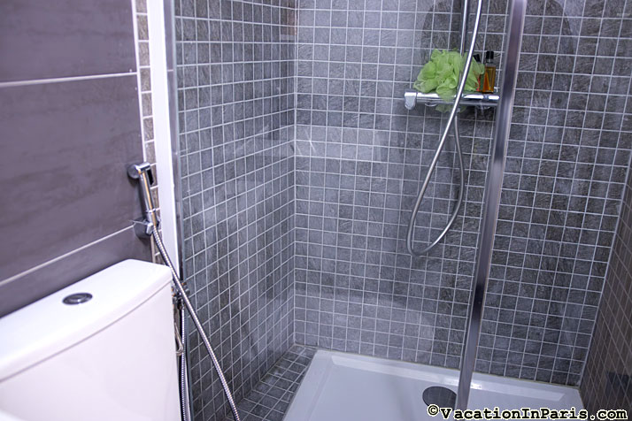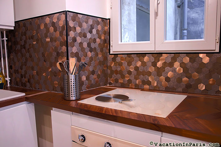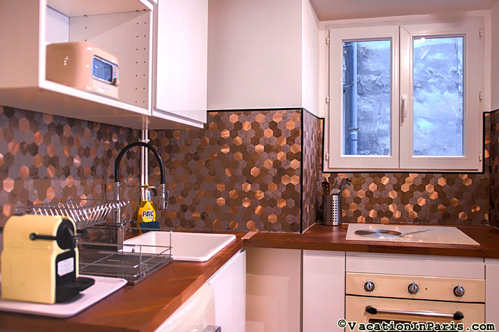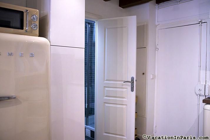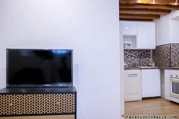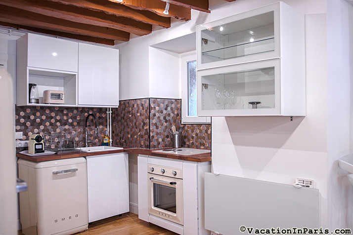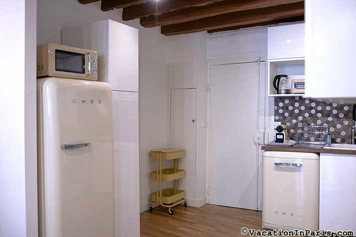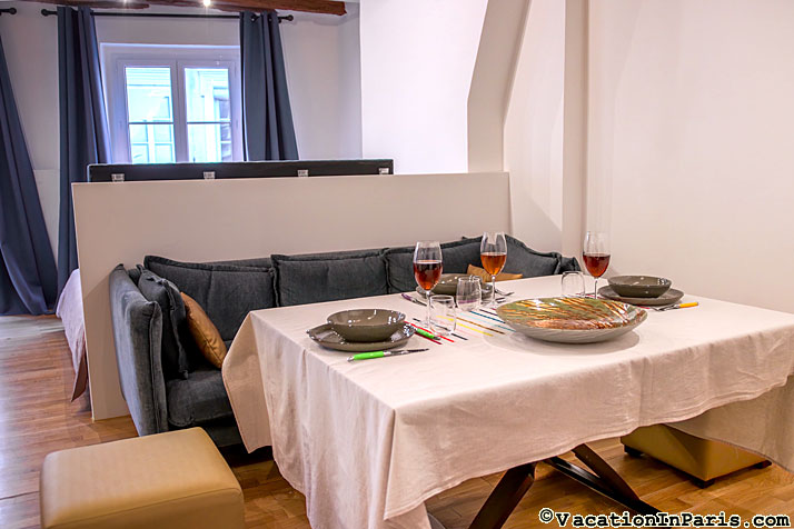 Despite being a studio, the owner has divided the sleeping from the living area with a half-wall, so it still feels large and open. Upon entering, the kitchen is directly to your left – the first things you’ll notice are the retro-style Smeg appliances, including a full-size refrigerator/freezer and dishwasher. The herringbone countertops provide plenty of space to prepare a meal from the Mouffetard market street just steps away. Next to the kitchen you’ll find a little dining nook with a modern high-top table and chairs, perfect for enjoying a cup of coffee or glass of wine.