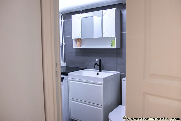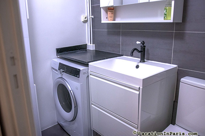 The bathroom has been fully renovated and feels modern with a mix of large and small charcoal gray tiles throughout. There’s a walk-in shower, crisp white vanity sink, towel warmer, and a small washer. Best of all, a large never-out hot water heater.